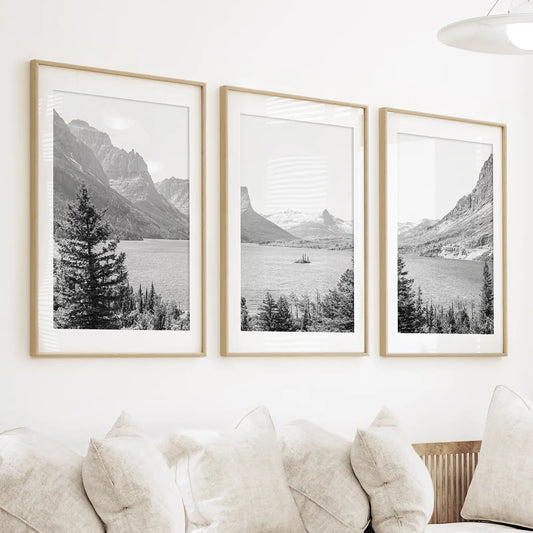 Glacier National Park. US Black White Mountain Lake Prints
