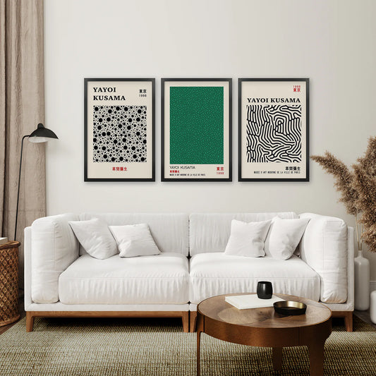 3 Piece Sage Green Abstract Japanese Wall Art Set. Yayoi Kusama