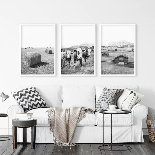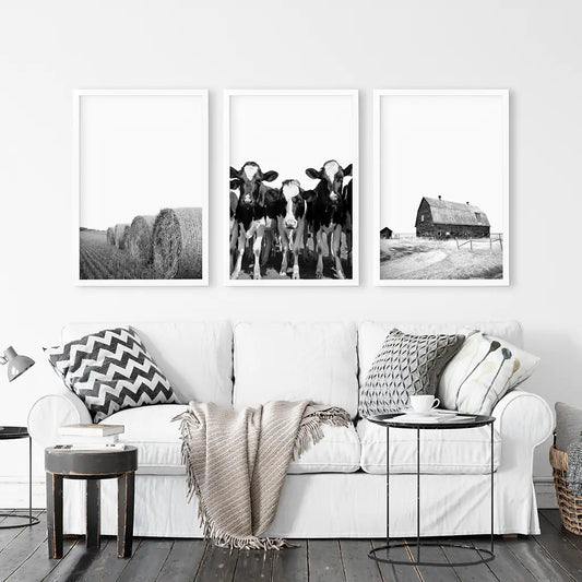 Black White Rustic Photo. Wall Art Set. Cows, Barn, Haystack