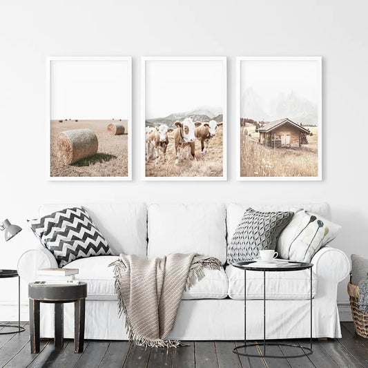 Rustic Fall Set of 3 Posters. Wooden Barn, Cows, Hay Bales