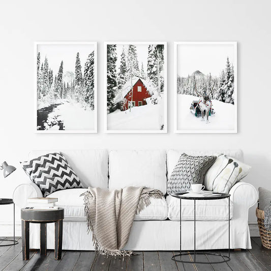 Christmas Deer Wall Art Set of 3. Red Barn, Frozen River