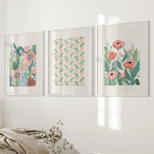 Boho Abstract Wall Art Set of 3 Prints. Green Leaves