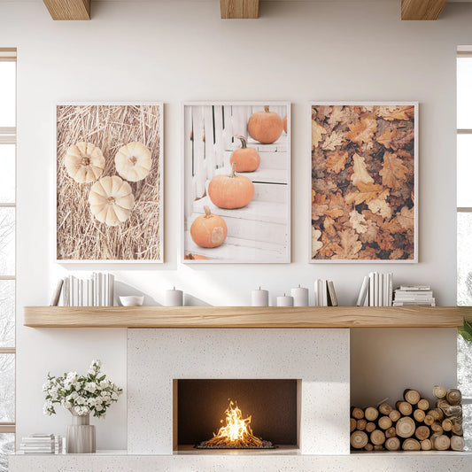 Cozy Fall Wall Art Set of 3. Pumpkins and Autumn Leaves