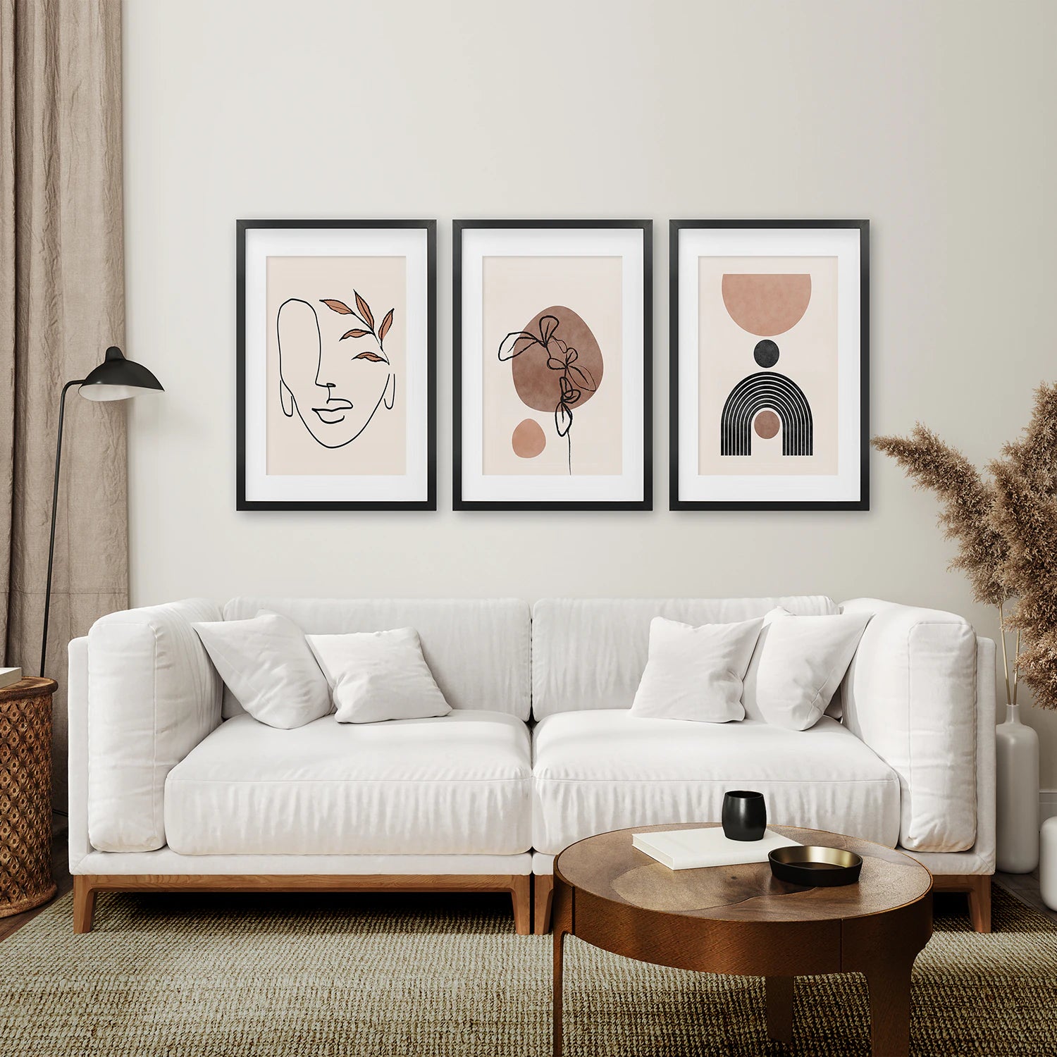 Elevate your home decor with this stunning set of 3 boho abstract art prints. Featuring a triptych of modern posters in earth tone colors, these prints in thin wood frames are perfect for over the bed wall décor. Available in different sizes.